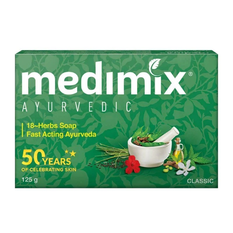 Medimix Ayurvedic 18-Herbs Classic Soap gently cleanses the skin with the power of traditional Ayurvedic herbs. It removes dirt effectively and leaves your skin feeling clean, fresh, and refreshed—perfect for everyday bathing.